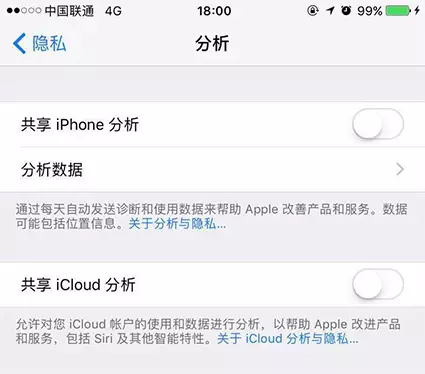 這個(gè)功能在我們?nèi)粘J褂弥胁]有什么卵用,還浪費(fèi)流量。So,進(jìn)入「設(shè)置」--「隱私」--「診斷與用量」,iOS10的朋友進(jìn)入「分析」 關(guān)掉它!