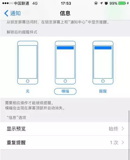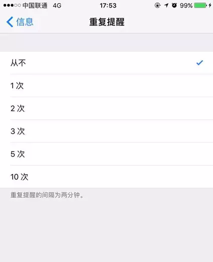 讓我們動(dòng)動(dòng)手指,直接關(guān)掉吧,可以通過「設(shè)置」--「通知」--「信息」,將「重復(fù)提醒」設(shè)置為“從不”,后面收到的短信就會(huì)只響一聲了。